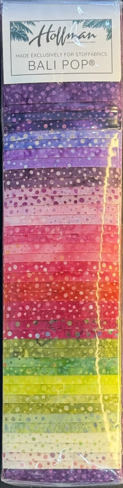 Hoffamnn bali pop - 40 strimler i batik stoffer der måler ca 2,5 x 44 inch. ( på dansk ca 6,25 x 110 cm) - Der er 2 af hver farve og 20 forskellige farver.