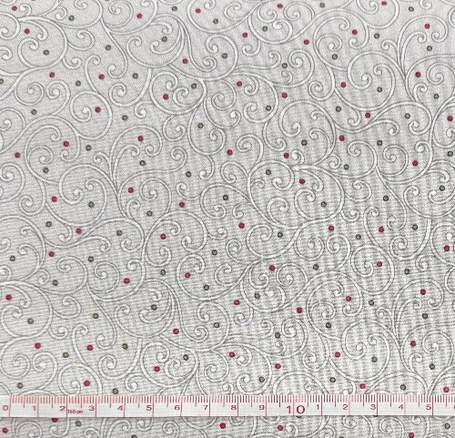 Grå bund med snirkel mønster i hvidt og røde og grønne prikker