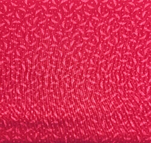 Rødt patchwork stof med mønster af fjer og prikker i lyserød nuance. Fjerene er ca 1 cm store.